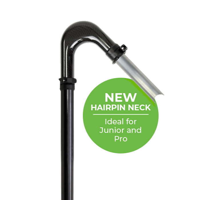 The tapered top pole slots into standard 44mm poles – and should be used to replace the standard top pole (and not in addition). The sturdy carbon fibre neck, features a clamp at the neck, and base for a secure fit.